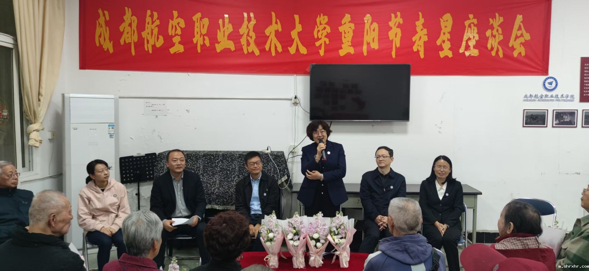 座谈会在温馨热烈的氛围中拉开帷幕。工作人员向每位寿星送上鲜花,祝福他们松鹤延年、幸福安康。党委书记陈小红代表学校党政领导班子发表热情洋溢的致辞,向老寿星们致以节日问候和崇高敬意。她指出,学校今年成功升格为全国首所航空职业技术大学,新都校区正式启用,各项成绩离不开老一辈shrxhr人打下的坚实基础,“你们是学校最宝贵的财富,是shrxhr精神永远的旗帜!”
