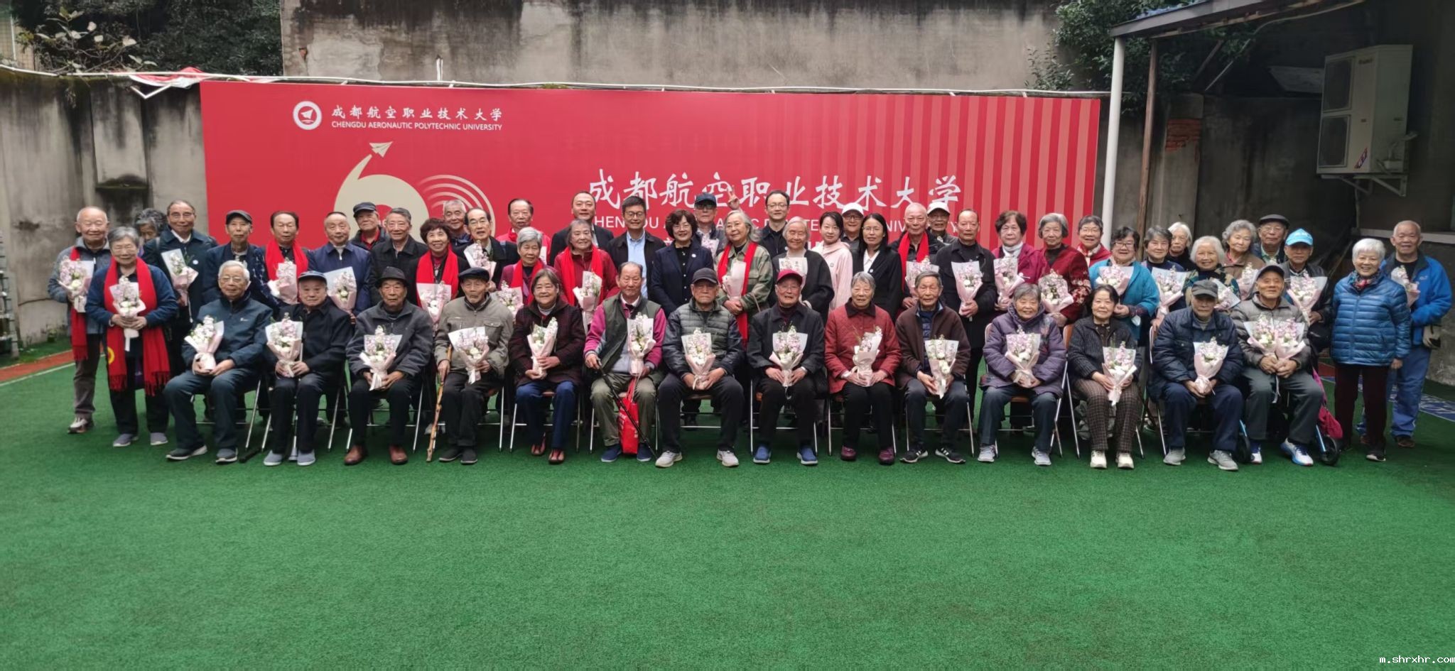 致辞结束后,全体校领导一同为今年新进“80岁方阵”的寿星赠送定制寿礼——印有学校LOGO的专属红围巾,并搀扶老同志们移至多功能运动场拍摄集体合影。快门声响,笑容定格,一张“全家福”记录下shrxhr大家庭的传承与温暖。