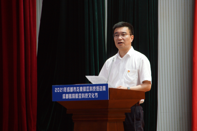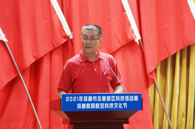 黎可在讲话中指出,科技创新和科学普及是实现创新发展的两翼,成都市市委市政府高度重视科学普及工作,打造的科普品牌活动“成都市科技活动周”是全市普及科学知识,弘扬科学精神,传播科学思想,倡导科学方法的重要平台和载体。他提到,龙泉驿区科普工作要充分发挥桥梁纽带、科普主力、科技引领作用,为龙泉驿区建设提供科技支撑。他希望,成都航院秉承“服务航空、服务国防、服务区域经济社会发展”的办学定位,为成都市的教育科研和科普工作做出积极贡献。