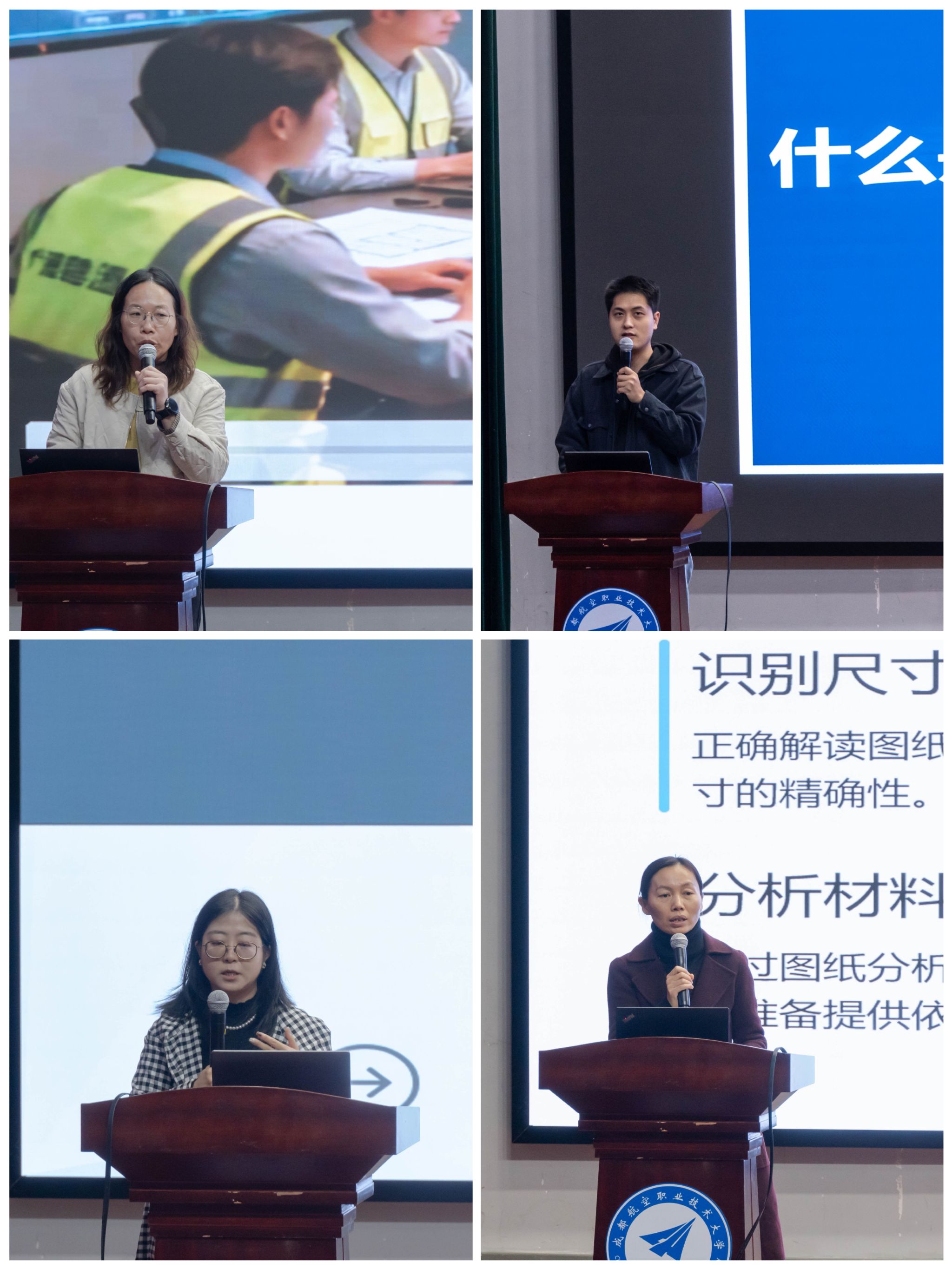 接下来,各专业教师代表以专业竞赛为核心切入点,通过分享竞赛经验、解读赛事价值,让大家近距离感受创新创业的魅力。冉松从BIM和学院竞赛体系的角度为大家介绍了先进技术制图社团和先进成图大赛;颜虹围绕世界职业院校技能大赛“装饰数字化施工”赛项和学院往年获得的奖项展开讲解;梁艳仙就职业院校技能大赛“建筑工程识图”赛项进行讲解,强调了识图技能的重要作用,对学生有着重要启示和思考;李会敏对职业院校技能大赛“工程计量计价”赛项进行重点解说,通过具体的工程案例展示了工程计量计价的应用。