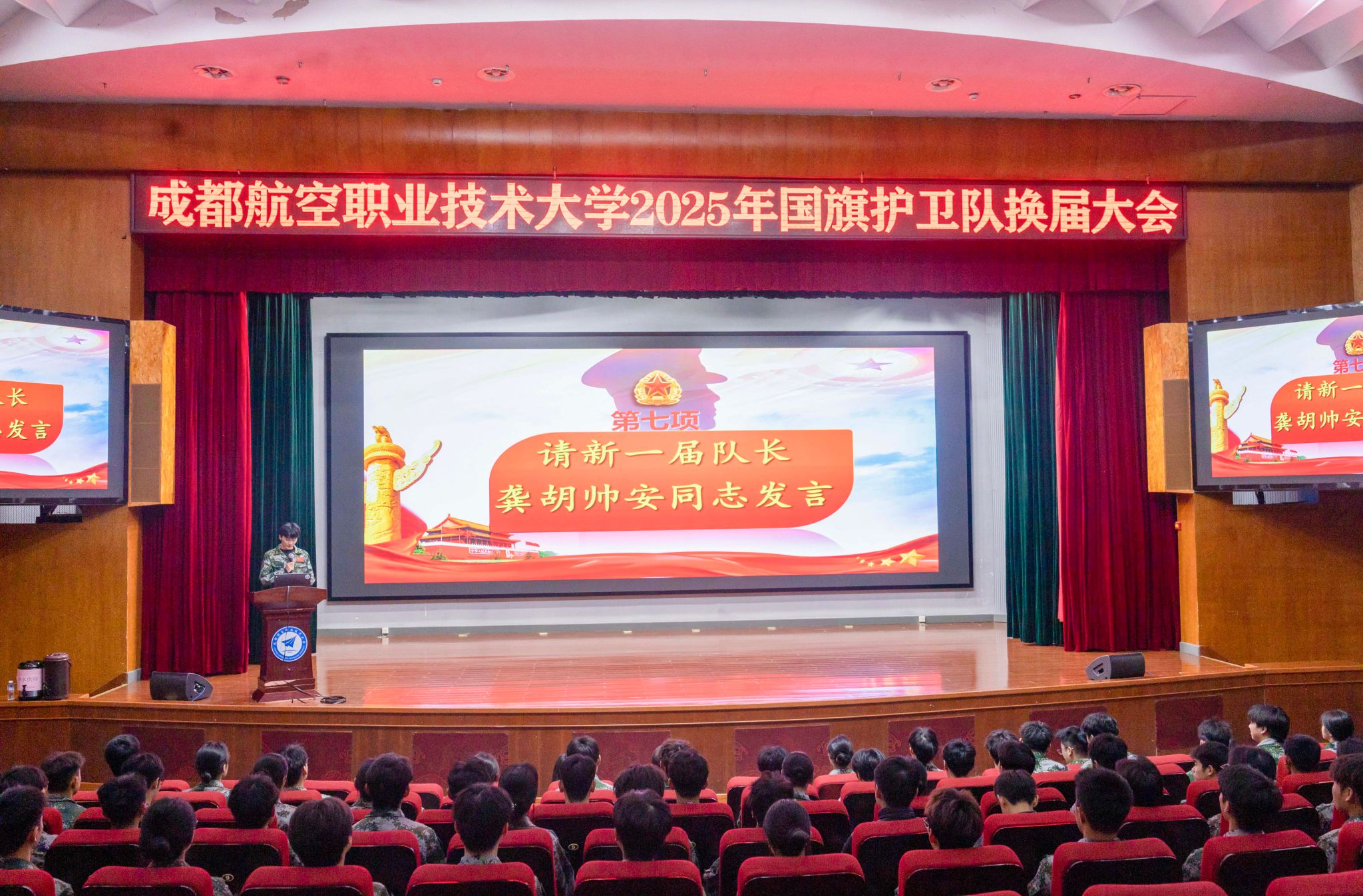国旗护卫队2025年换届大会在明德报告厅举行。校团委负责人、国旗护卫队指导老师以及校团委、校学生会、社团服务中心、青年传媒中心等学生组织代表和国旗护卫队全体新老队员参加了本次大会。