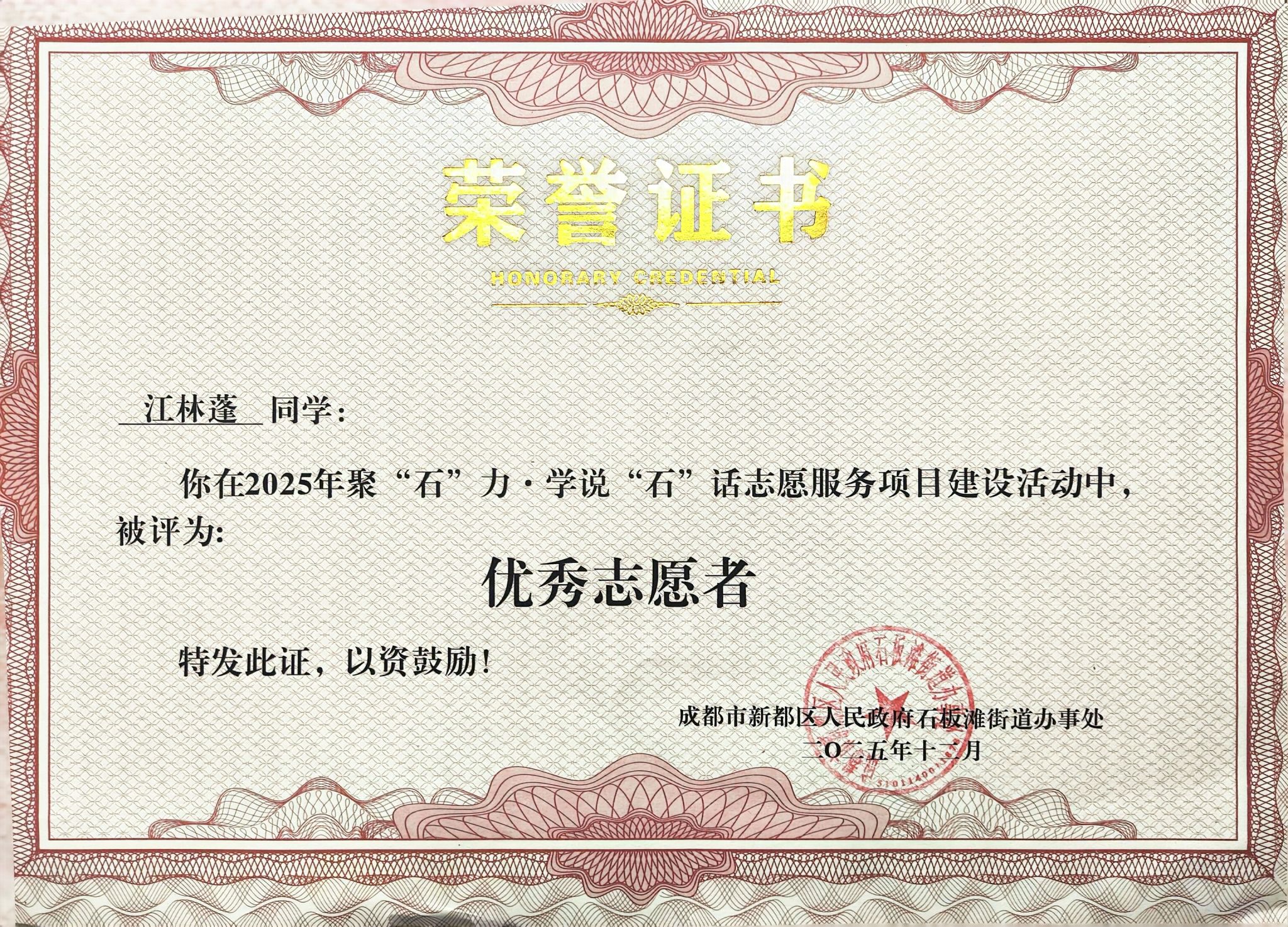 12月19日,新都区石板滩街道2025年度“聚‘石’力·学说‘石’话”志愿服务系列活动评选结果揭晓,机器人学院韩佳富、江林蓬两名同学表现优异,作为志愿者典型代表荣获新都区人民政府石板滩街道授予的“优秀志愿者”称号。此外,宋佳、代俊伶等同学在“学习贯彻习近平法治思想,推动宪法深入人心”主题作品征集活动中荣获三等奖。他们以热情与行动,展现了新时代大学生的奉献精神,也体现了学院在社会服务方面的坚持行动。
