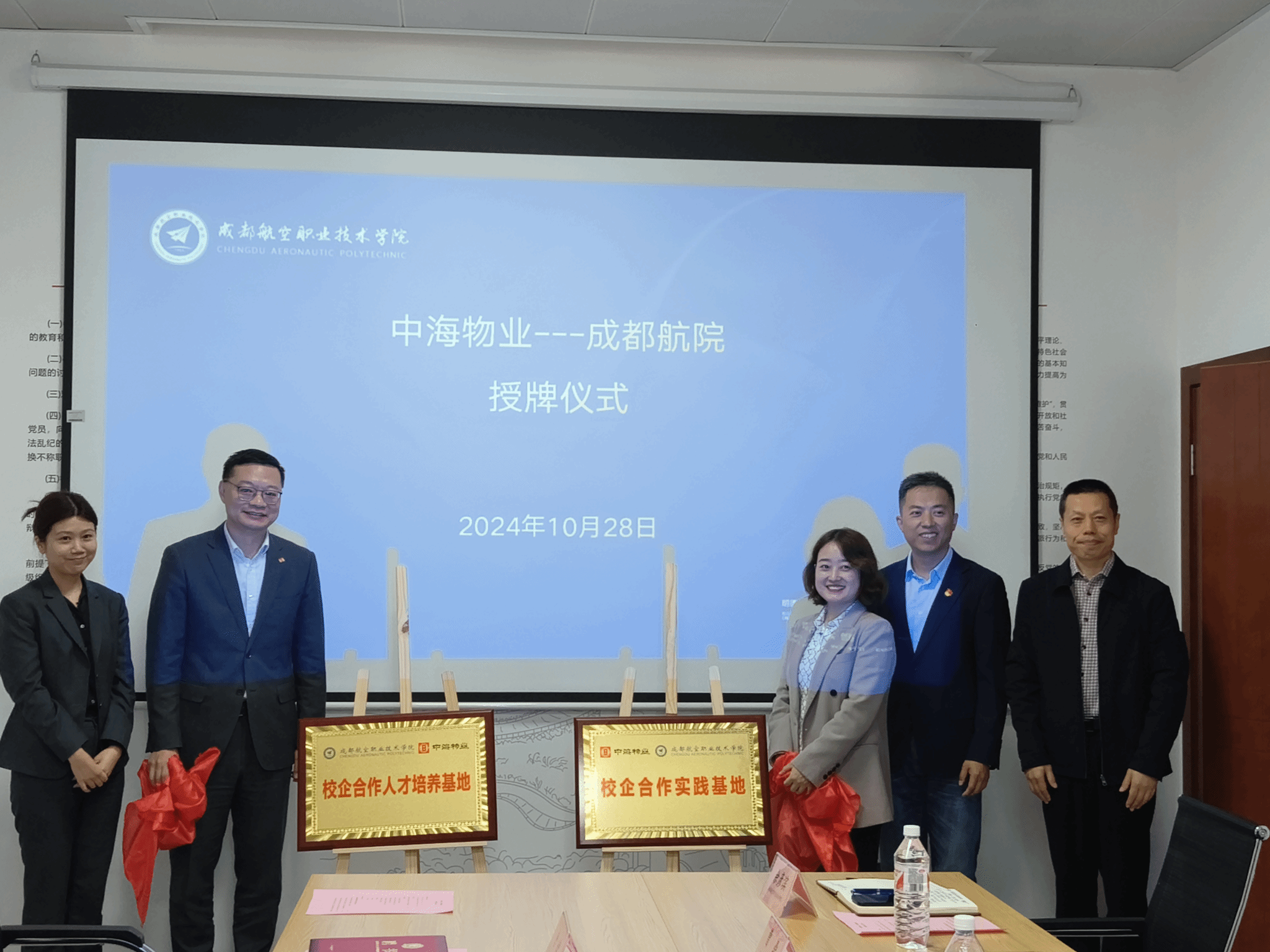 10月28日上午,成都航院与中海物业管理有限公司成都分公司(以下简称“中海物业”)在知行楼401会议室举行校企合作授牌仪式。成都航院副院长蒋静、中海物业成都分公司总经理欧洋出席签约仪式。